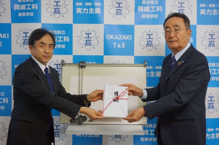 小型の「製図機械」をご寄付いただきました 株式会社「イクス」様から百五銀行の私募債を利用して、本校に小型製図機械が寄贈されました。今後、本校の製図指導に利用させていただきます。 イクスの大河原会長様から清水校長に目録の贈呈(寄贈された製図機械の前にて)