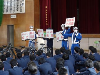 交通安全教室 本日は愛知県警察本部交通機動隊自転車対策小隊B-Forceおよび愛知県岡崎警察署交通課総務係の方々にお越しいただきました。 自転車事故や交通ルール・マナーについて、実際に自転車での実演等を含んだ貴重なお話をいただきました。